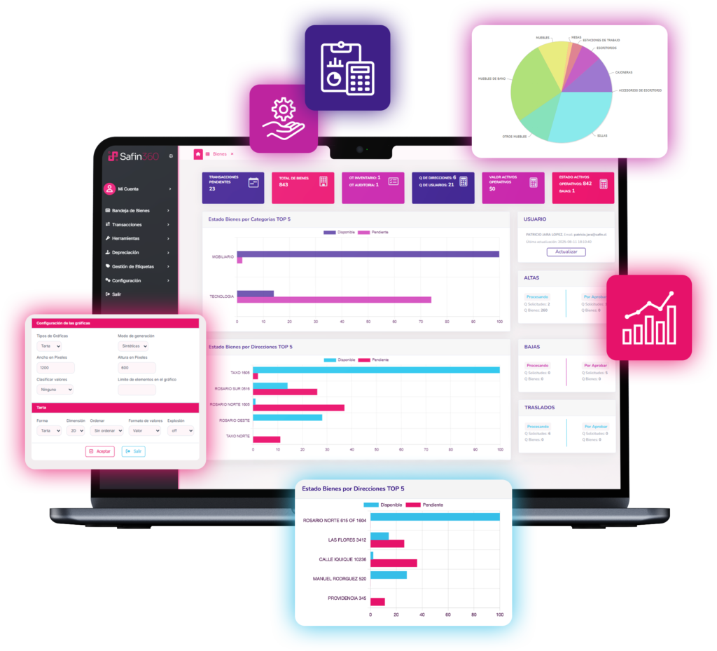 La multifuncionalidad de SAFIN, pone a tu disposición una herramienta personalizada que te permitirá automatizar los diferentes procesos que implica el correcto registro, control y gestión de los bienes, mediante una interfaz gráfica sencilla y amigable. Además, proporcionará un acceso rápido y actualizado de la información desde cualquier punto que tenga acceso a la base de datos (Aplicación Web).